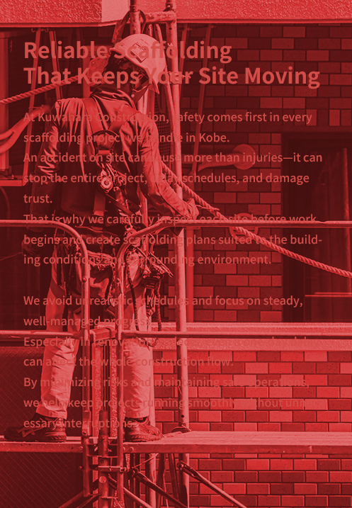足場工事において「事故を起こさないこと」を最優先に考えています。足場工事中の事故は、作業員のケガだけでなく、現場全体の停止や工程遅延につながり、元請け様の信用問題に発展する可能性もあります。