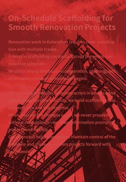 建物形状や敷地条件、周辺環境、工期を踏まえたうえで、安全性と作業性のバランスを考えた足場計画をご提案。神戸市で足場工事を依頼する際、「この現場でも大丈夫だろうか」と迷われるケースでも、まずは一度ご相談ください。