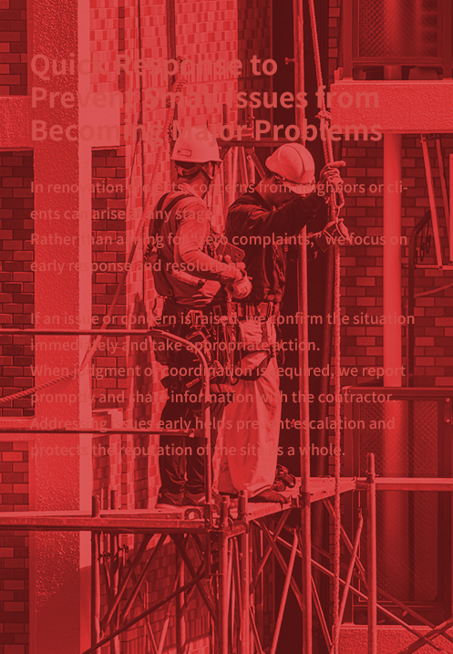 正直なところ足場工事に関しては、近隣や施主様からの指摘が発生することも珍しくありません。そこで桑原建設では「クレームをゼロにする」ことよりも、「大きな問題になる前に対応する」ことを重視しています。